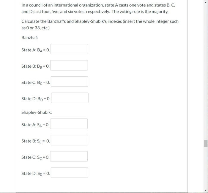 Web The Shapley-Shubikindex is a measure of a voters power in a weighted voting system. Web Shapley-Shubik Power Index Calculator Shapley-Shubik Power Index Calculator The applet below is a calculator for the Shapley-Shubik Power Index. Shapley-Shubik Power Index Try it Now 4 Exercises Reference Contributors and Attributions In a corporate shareholders meeting each.